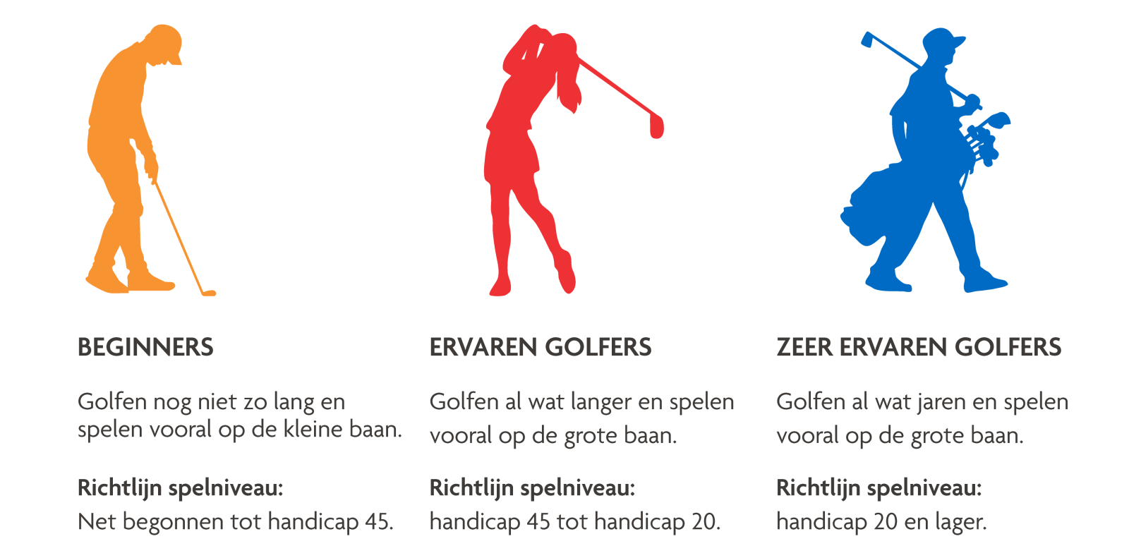 Bij de activiteiten op onze websites vermelden wij zoveel mogelijk het niveau van de activiteit om te voorkomen dat je als beginner bij een activiteit met zéér ervaren golfers terecht komt. Je kunt ook alle activiteiten terug vinden in de Activiteiten Agenda van Hollandsche Golfclub, klik hier.