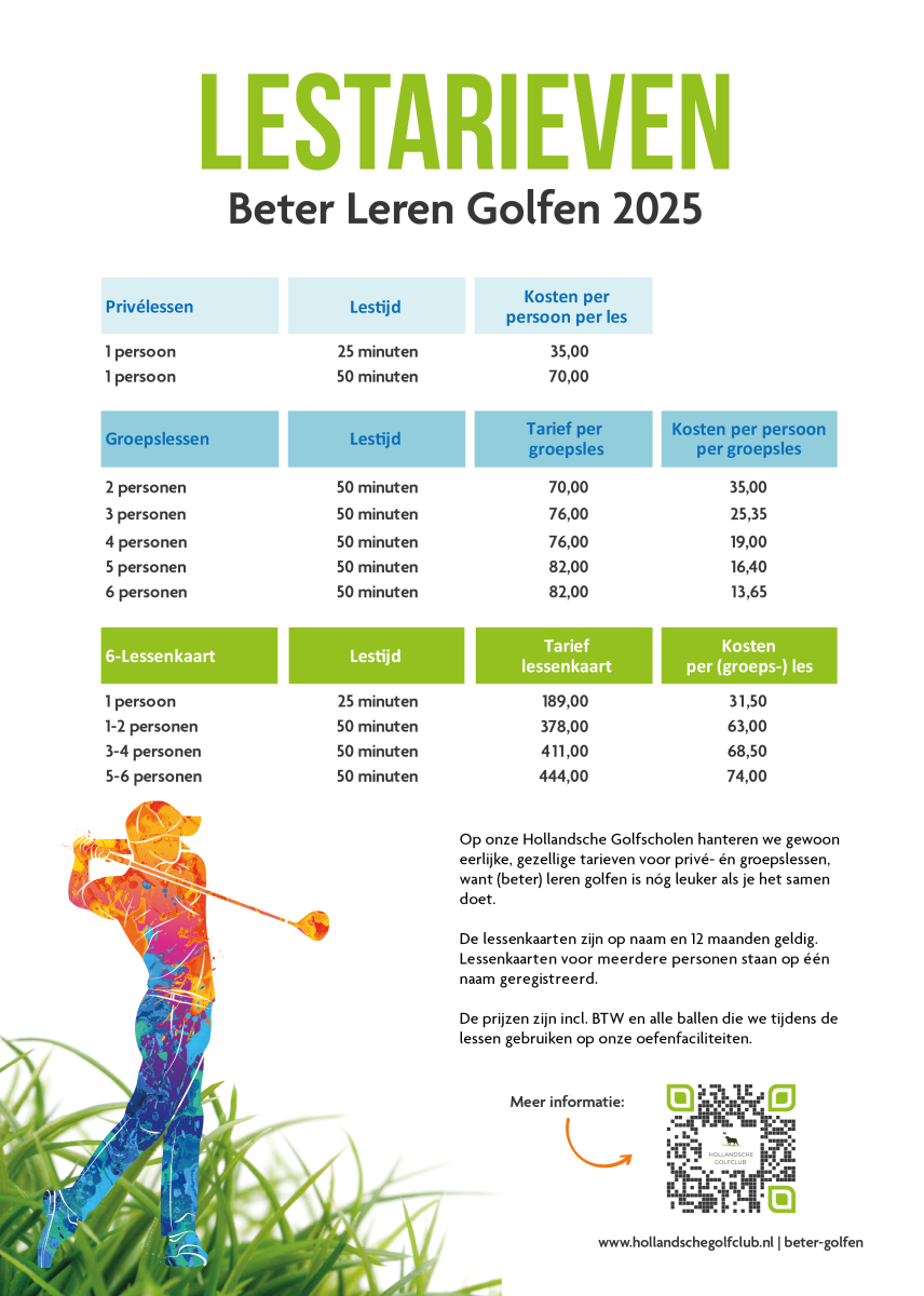 Dan hebben wij aantrekkelijke all-inclusive lespakketten, incl. 3 maanden lekker veel golfen, gebruik van leenset met clubs, golfballen op de driving range en meer ... klik hier.