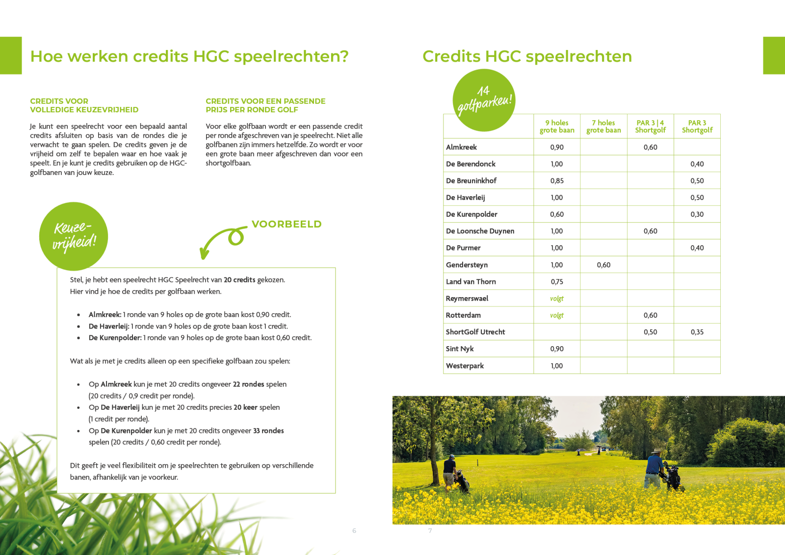 Met je speelrecht kun je op alle golfparken van de Hollandsche Golfclub spelen. Voor iedere ronde golf wordt een passend tarief – een credit – van je speelrecht afgeboekt.